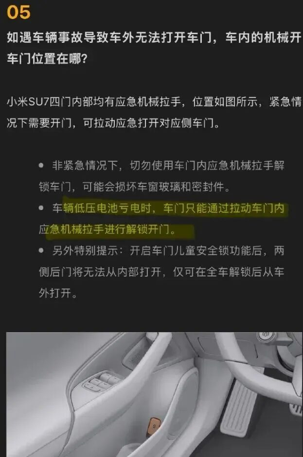 更令人费解的是机械应急拉手的设计。小米SU7将机械应急拉手隐藏在储物格内的设计,被业内指出存在明显缺陷——乘员在碰撞后的慌乱中难以快速操作,客观上降低了逃生可能性。根据小米SU7用户手册,应急拉手位于“车门储物格内侧上方”,但实际操作需完成“弯腰-拉开储物格盖板-找到红色拉绳-连续拉动两次”三个步骤。被网友吐槽“像在玩密室逃脱”。